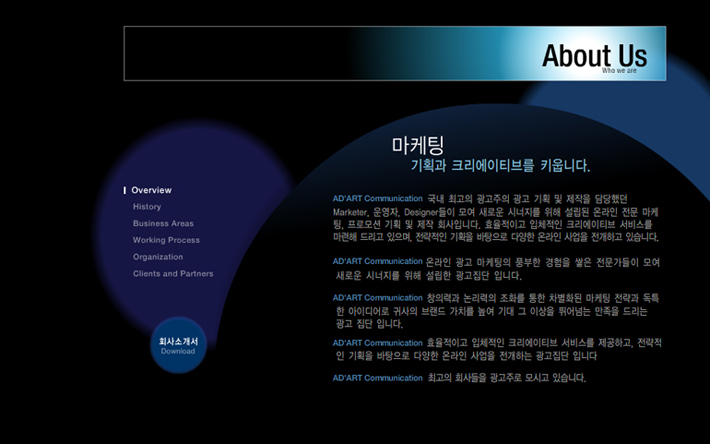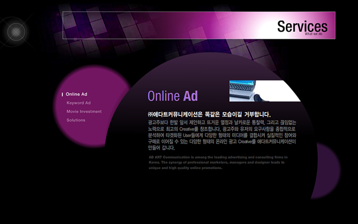 Client : Ad'art Communication Type : Web site Period : 2007.05 ~ 2007.07 URL : www.motioneye.co.kr/portfolio/adart/index.html